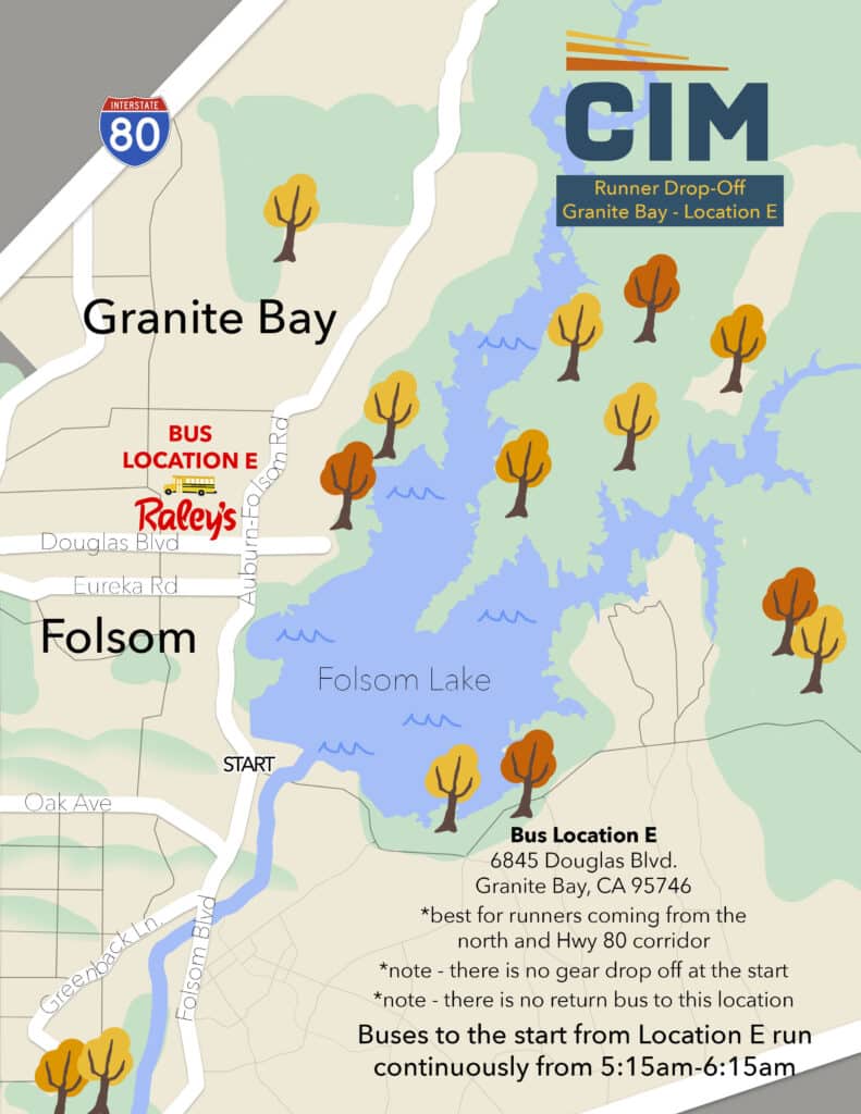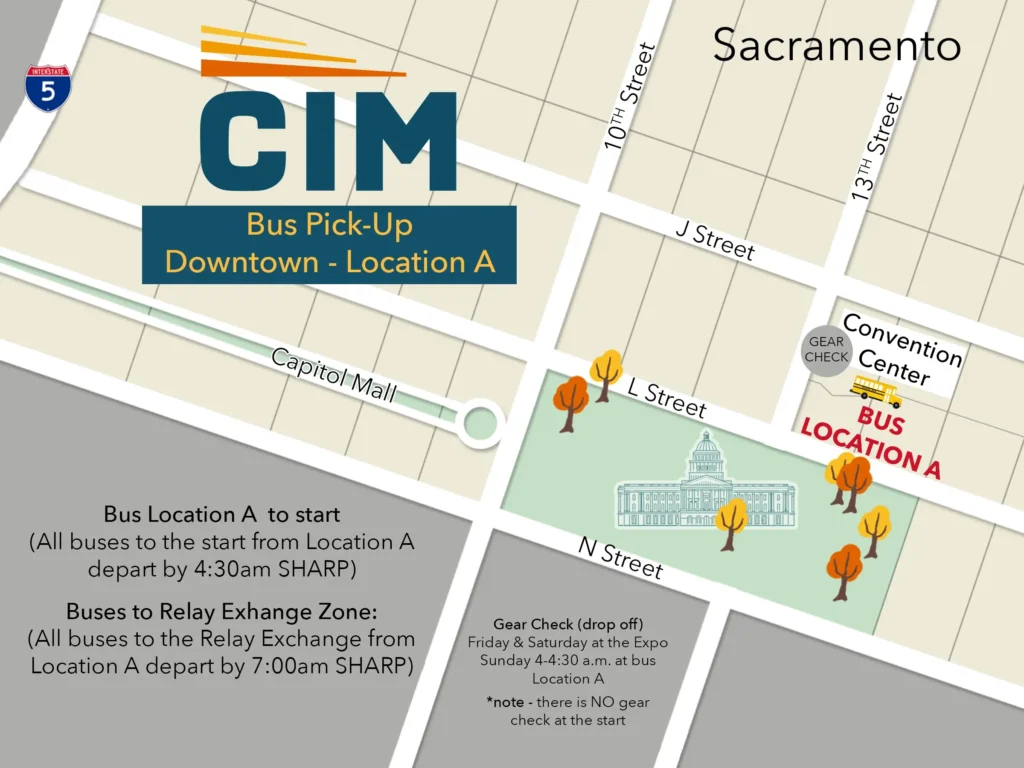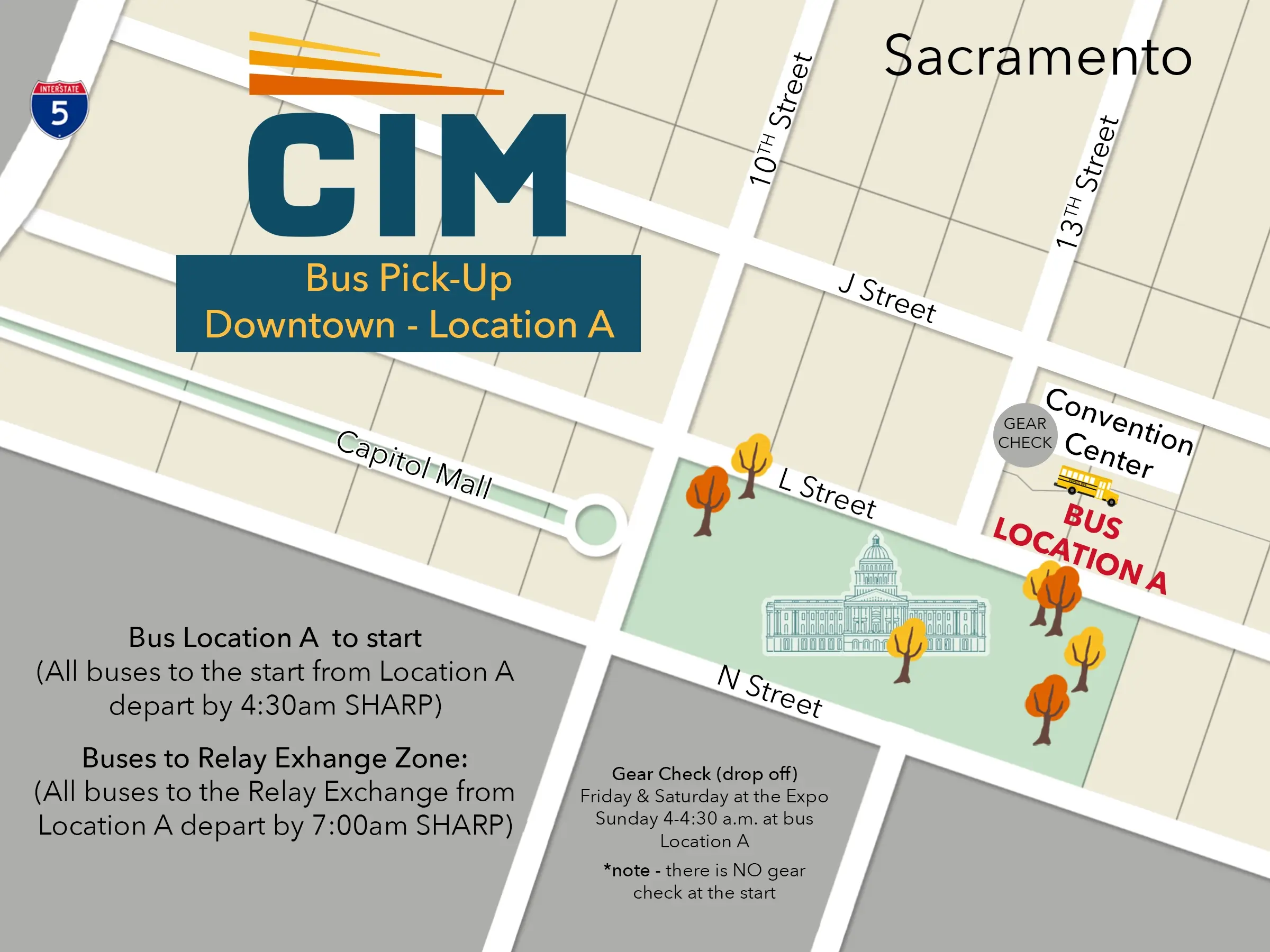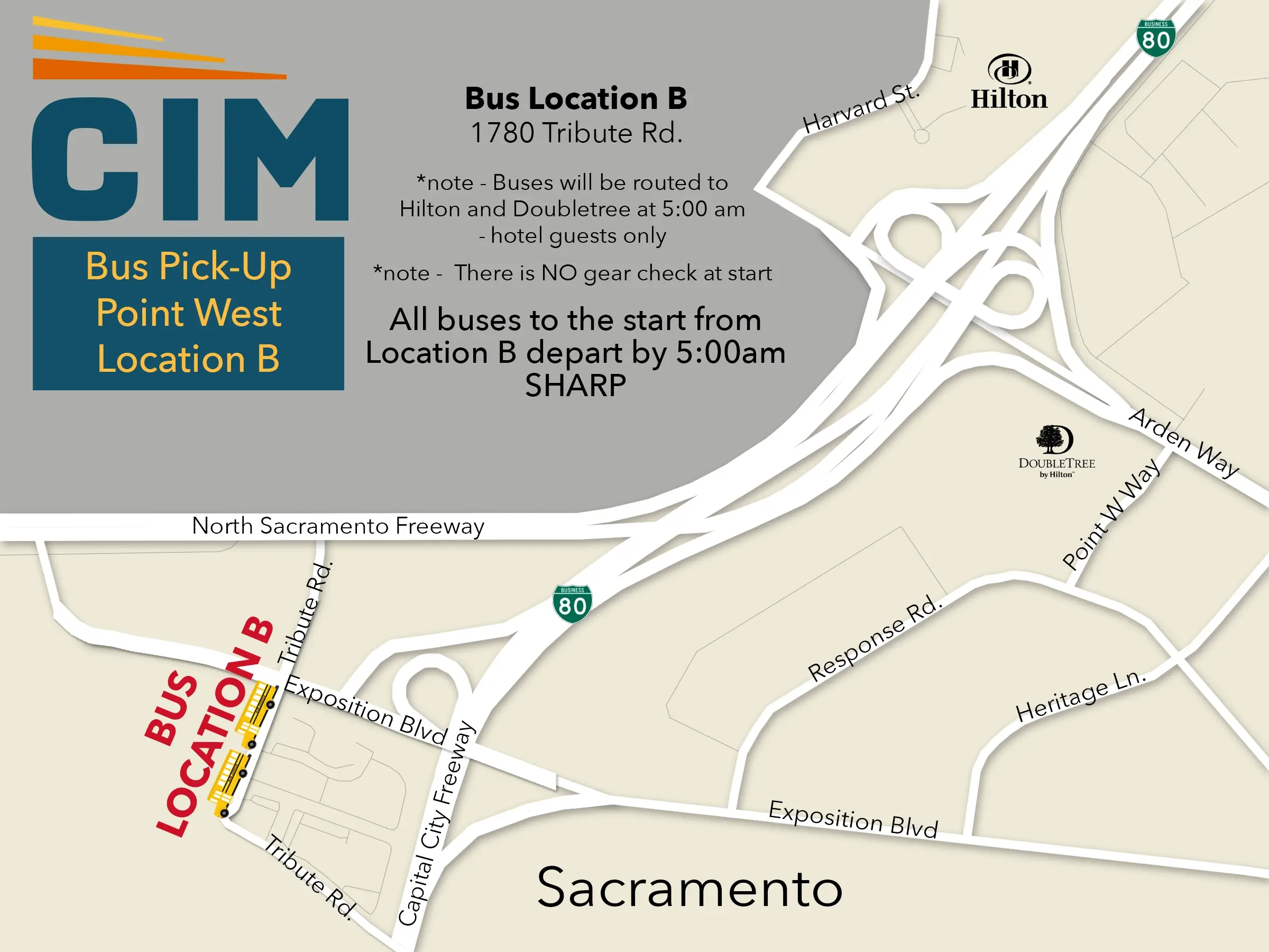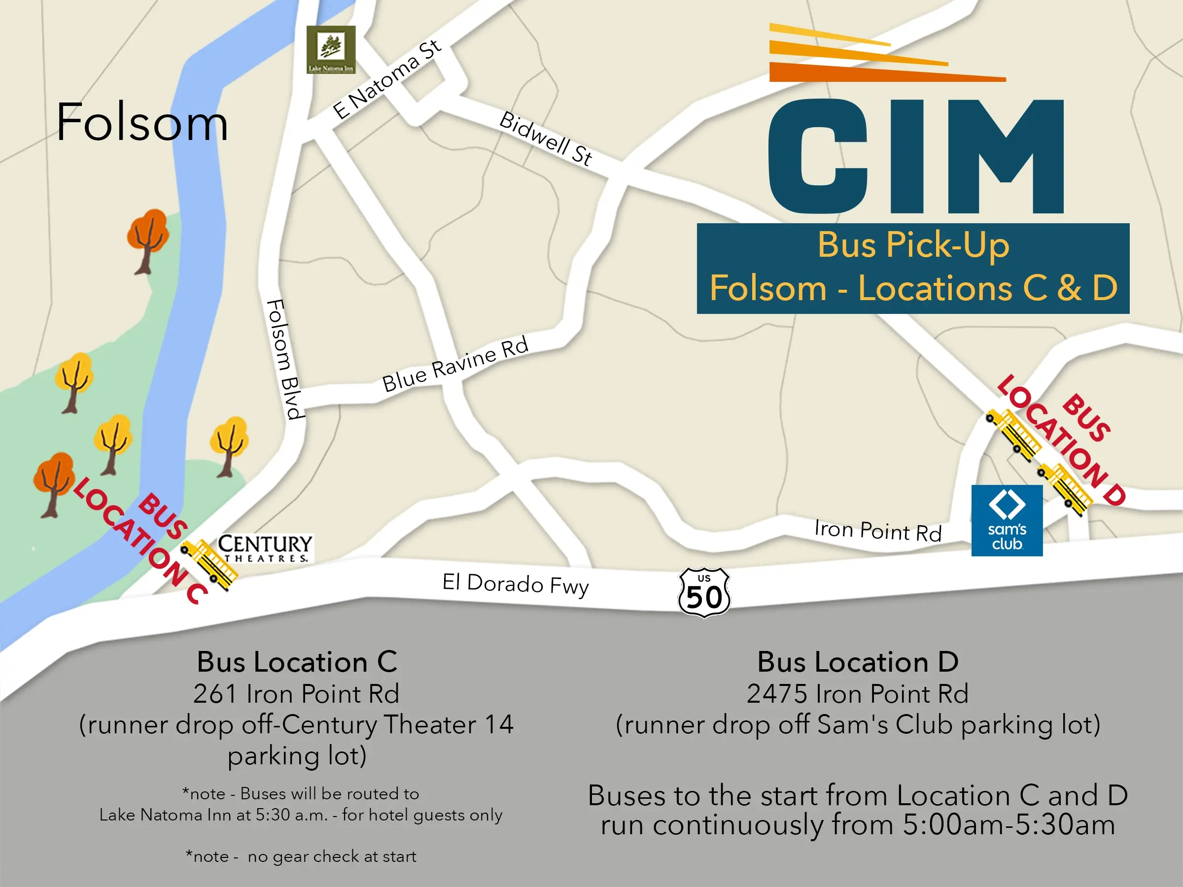 Return bussing from the CIM Finish Area after the race back to Locations B, C, and D (servicing guests at Folsom and Point West Hotels) will be provided on a continuous basis from 10:30am-1:45pm. For more information on post-race hotel return bussing click here.